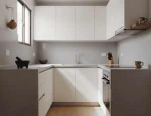 - Puertas de melamina o MDF con tiradores negros, para mantener coherencia visual.